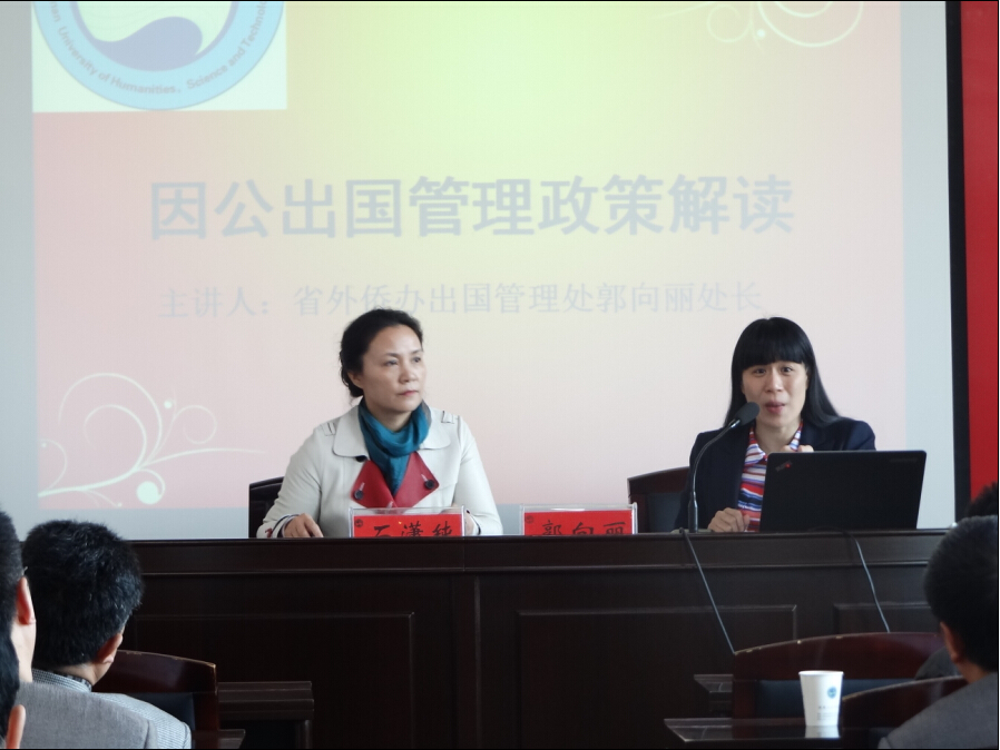 2014年11月5日,湖南省外事侨务办公室出国管理处处长郭向丽应邀来KY官网讲学。讲座由副校长石潇纯主持。