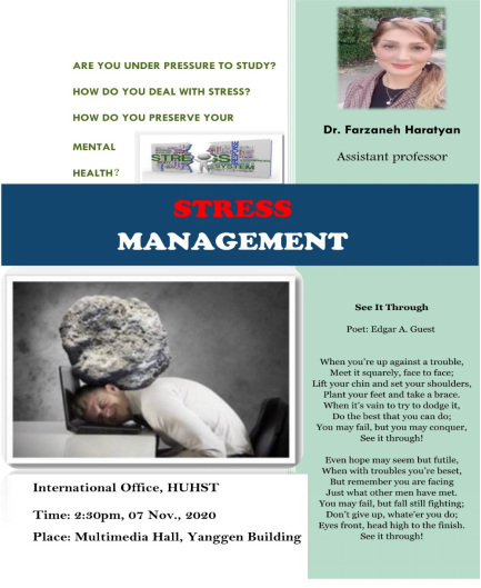11月7日,KY官网外籍专家Farzaneh博士在养根楼报告厅开展了关于心理学方面的讲座,讨论了后疫情时代如何减压与健康生活。讲座指出合理膳食、适当运动、平衡心理等是最基本的健康生活方式;强调良好的心理状态在一定程度可以提高人们的免疫力,而焦虑紧张、恐惧、担忧则影响身体健康。后疫情时代,我们依然要重视新冠疫情的严峻性,做好自我防护同时也要主动调适好自己的心理状态,照顾好自己的身心健康,才能切实提升自身的免疫力。现场高潮迭起,掌声雷动,气氛非常热烈。此次讲座既是一场学术交流,又是一次中西文化的碰撞,与会师生均表示学到了很多,希望以后能有更多这种类型的讲座。