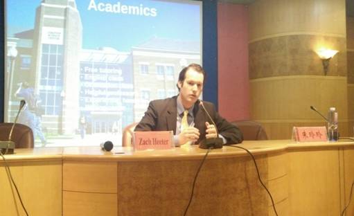 宣讲会上,Larissa用PPT介绍了弗罗斯特堡州立大学的地理位置,怡人的气候环境;Zach详细阐述了该校便利而现代化的教学环境,丰富的娱乐项目,学生优良的居住环境,费用减免,学业成就各方面的优势,并以播放该校宣传片的形式,生动展现了该校的校园文化。最后FSU中国项目负责人朱玲玲老师就赴FSU交换所需具备的条件进行了详细解答。