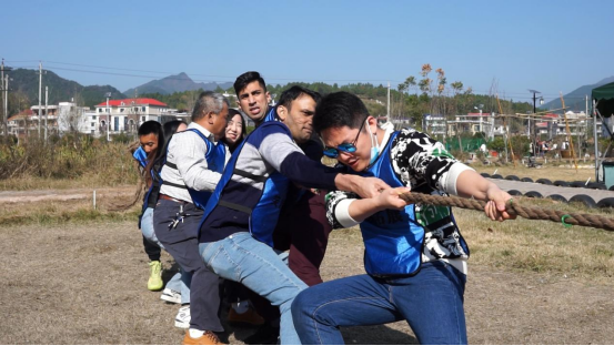 “楚汉争霸,舍我其谁”响亮的口号声拉开活动帷幕。分为黄蓝两组后,各组用脚顶着脚;身子住后倾,双手像只铁钳似的,用力抓住大麻绳。等待哨声一响,便使出“洪荒之力”。大家手上的筋脉突兀。肌肉紧绷,身上的汗毛发直,手心被绳子勒得发红,经过三局两胜,最后蓝队赢得了比赛胜利。