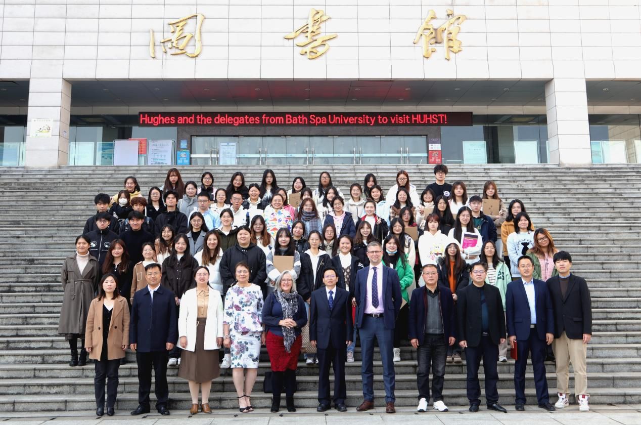 On Nov. 27, 2023, a delegation from Bath Spa University (BSU) in the UK visited HUHST for academic exchange. The delegation comprised Benjamin Samuel Hughes (Deputy Pro Vice-Chancellor of BSU), Polly Loveday Derbyshire (Dean of the School of Business), Jiemin Tomita (Director of International Enrollment and Cooperation Department), and Huang Zichen from its China office. They were warmly welcomed by Prof. Chen Zhiguo, Member of CPC Committee and Vice President of HUHST. A discussion and exchange session took place at the School of Business, which was also attended by Huang Min (Director of the International Cooperation and Exchange Office), leaders from the School of Business, and other representatives. Following the meeting, Benjamin delivered a presentation for and exchanged views with students and faculty from the School of Education on the Early Childhood Education program (a cooperative education program). Besides, Polly conducted an open class for students and faculty from the School of Business.