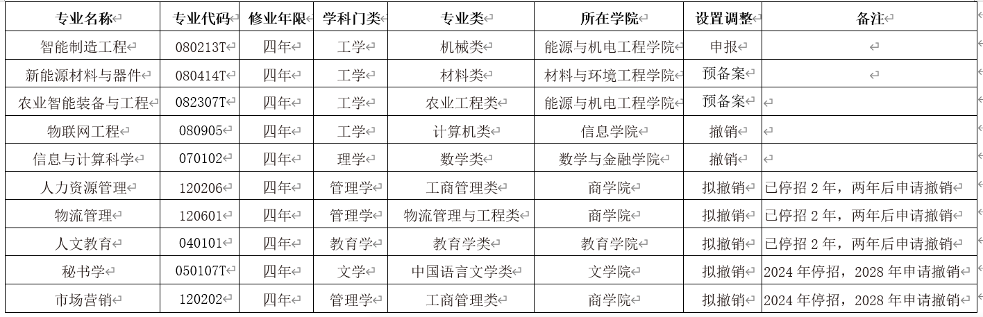 根据《教育部高等教育司关于开展2024年度普通高等学校本科专业设置工作的通知》文件要求,经学院申报、学校组织专业设置评议专家审议、学校校长办公会议审定,同意2024年申报智能制造工程专业,预备案新能源材料与器件和农业智能装备与工程2个专业,撤销物联网工程等7个专业,现予以公示: