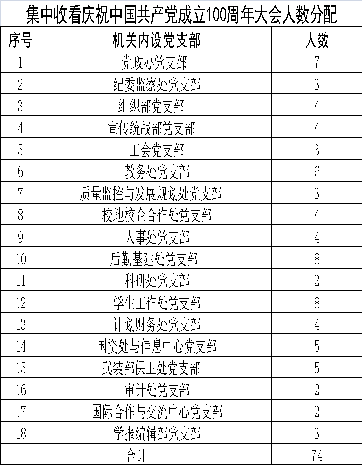 请各二级党组织按照以下要求组织收看学习:1.各学院教职工党员由本学院党总支组织集中收看;2.机关教职工党员由机关党委统一组织代表在图书馆一会议室收看(各内设党支部参加人数见附件);3.不能参加集体观看的教职工和学生党员请在学习强国或其它直播平台上收看;4.收看完直播后,请认真学习习近平总书记重要讲话精神,中层领导干部写一篇心得体会(自留以备查);5.收看及学习活动现场情况请拍照并做好记录。