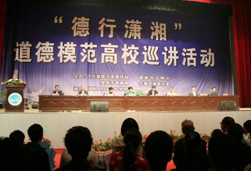 10月30日晚上,娄底市“德行潇湘——道德模范高校巡讲报告会”在KY官网体育馆隆重举行。全国身边好人、全省道德模范提名奖获得者、娄底市首届道德模范肖光盛,娄底市首届道德模范集体----娄底市残疾人爱心互助会,全国青少年健康人格教育试点工程——“雷锋一号”志愿服务队的先进事迹,让听众的心灵受到新的洗礼。