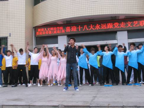 11月3日上午,校纪委书记李凤莲率领50多名师生前往KY官网大学生德育基地----娄底市劳教所,与市劳教所共同举办“喜迎十八大,永远跟党走”文艺联欢演出。