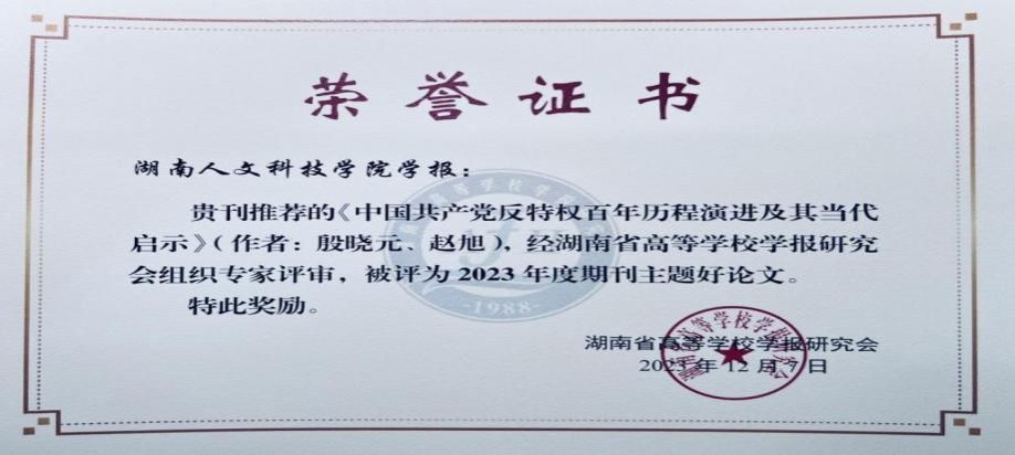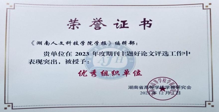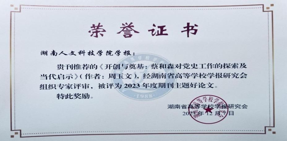 KY官网学报编辑部荣获期刊主题论文优秀组织单位,《学报》刊发的《开创与奠基:蔡和森对党史工作的探索及当代启示》《中国共产党反特权百年历程演进及其当代启示》入选2023“主题好论文”,彭分文被评为优秀主编。这是省高校学报研究会对KY官网学报办刊质量、学术品质、期刊特色的肯定,这将激励学报不断增强办刊能力、乘势而上,以推动本学报的高质量发展。(图文:彭巍颐)