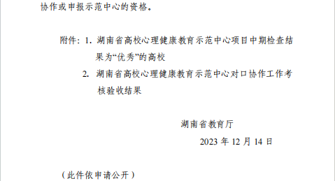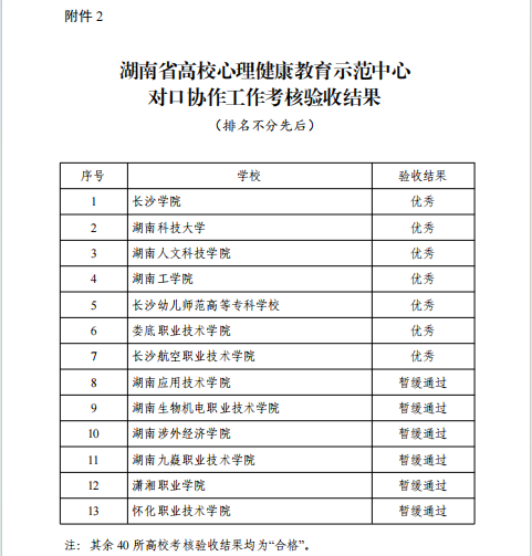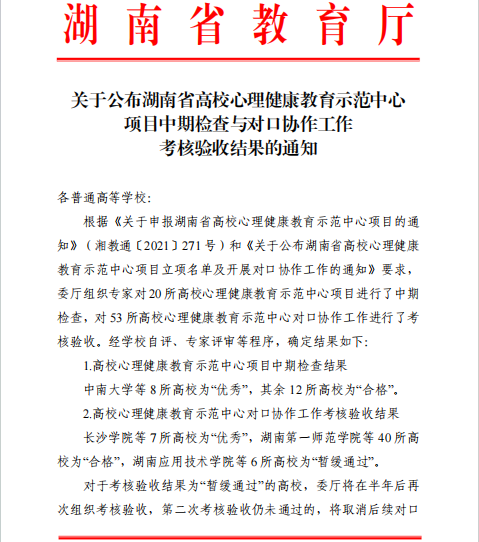 近日,湖南省教育厅公布了湖南省高校心理健康教育示范中心项目中期检查与对口协作工作考核验收结果,专家组共对53 所高校心理健康教育示范中心对口协作工作进行了考核验收,其中 40 所高校为“合格”,KY官网与长沙学院、湖南科技大学、湖南工学院等7所院校均获评“优秀”。