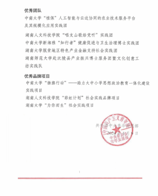 近日,共青团中央对2023年“三下乡”社会实践活动中表现突出的优秀集体、个人和项目进行通报表扬。KY开元集团官网入口“唱支山歌给党听”实践团荣获2023年“三下乡”社会实践优秀团队,KY官网“彩虹计划”社会实践品牌项目荣获2023年“三下乡”社会实践优秀品牌项目(全国共计71个、全省仅湖南大学“为你而生”、中南大学“扬旗行动”和KY官网“彩虹计划”三个品牌项目获得本项荣誉)。