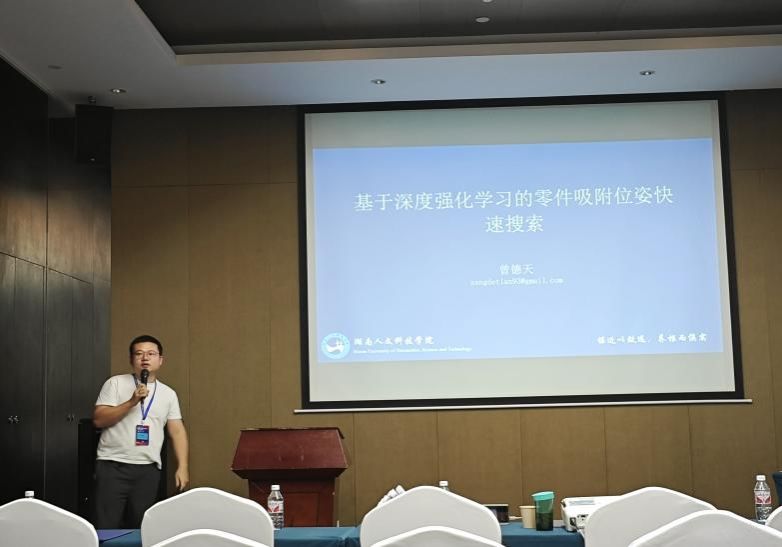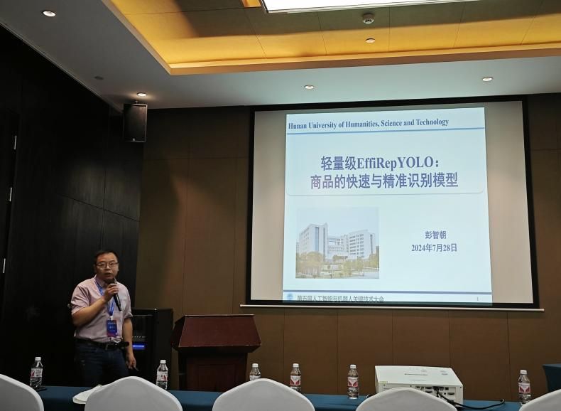作为协办单位,信息学院积极参与了会议的筹备与组织工作。会议期间,彭智朝教授在大会上发表了题为“轻量级EffRepYOLO:商品的快速与精准识别模型”的主题报告,展示了一种高效、轻量级的商品识别模型EffRepYOLO,能够在保持高精度的同时显著降低计算复杂度,适用于资源受限的设备和场景,引发了与会者的高度关注和热烈讨论。曾德天老师发表了题为“基于深度强化学习的零件吸附位姿快速搜索”的专题报告,详细讲解了如何利用深度强化学习技术,实现对工业零件吸附位姿的快速搜索优化,从而提高制造过程中的效率和精度。