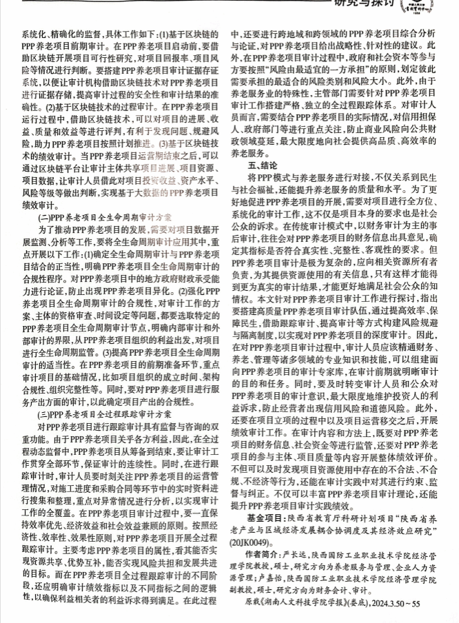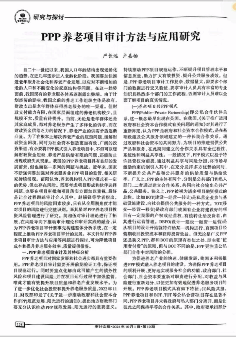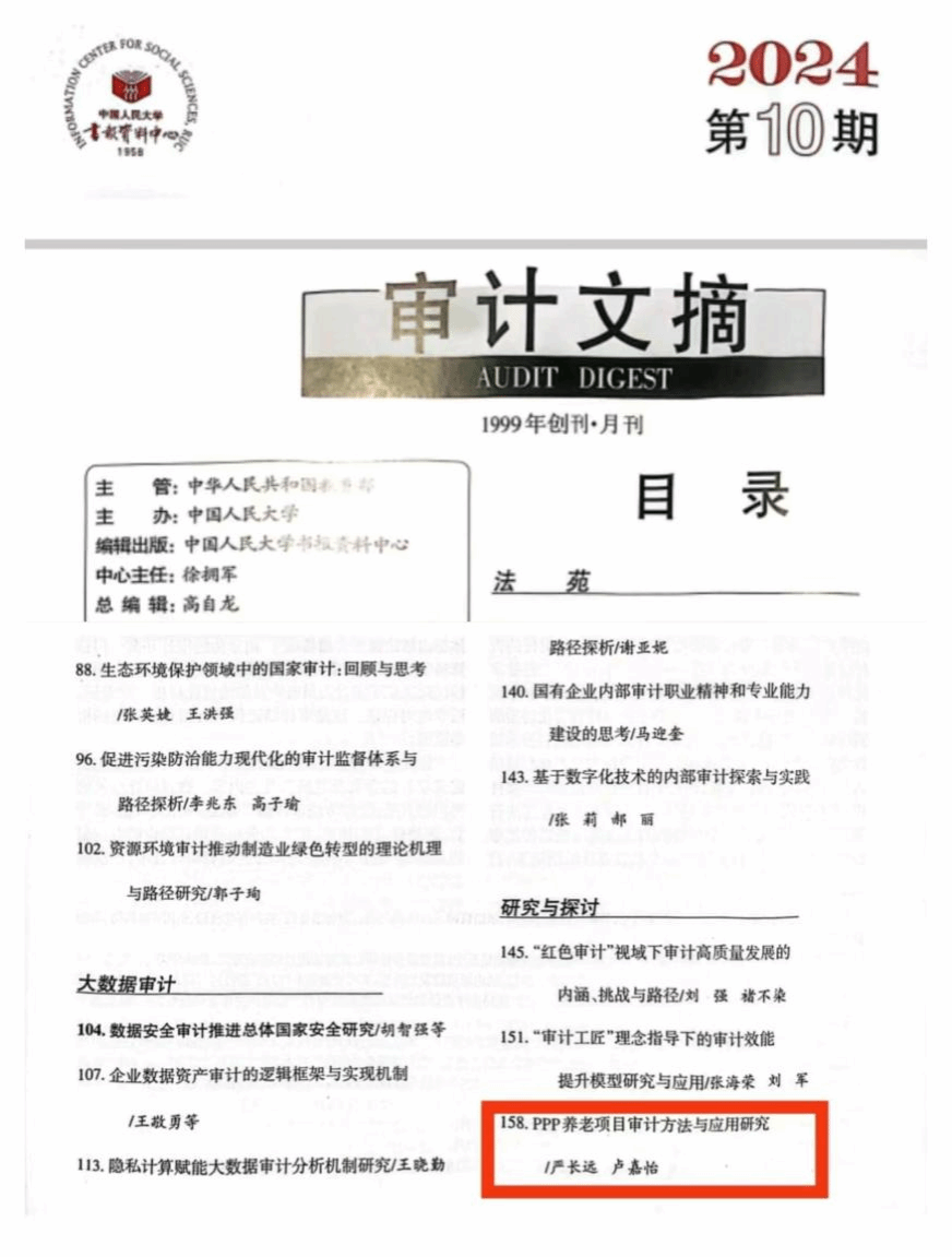近日,刊发于KY官网《KY开元集团官网入口学报》2024年第03期的论文《PPP养老项目审计方法与应用研究》(作者:严长远 卢嘉怡)被中国人民大学书报资料中心复印报刊资料《审计文摘》2024年第10期全文转载。这是KY官网学报今年继第2期的论文《“郑义门”千古家训的时代价值与实践路径》被人大复印资料全文转载后的又一篇全文转载。