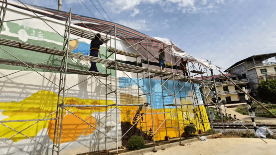 其中一组墙绘以乡村丰收为主题,画面中一辆拖拉机满载金黄的麦垛,两位农民脸上洋溢着幸福的笑容。师生们通过细腻的笔触和丰富的色彩,生动展现了乡村丰收时的喜悦场景。金黄的麦浪、饱满的麦穗,仿佛让人置身于麦香四溢的田野间,真切感受到农民辛勤劳作后的收获之喜。