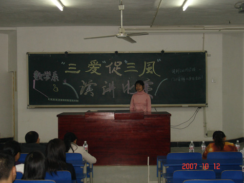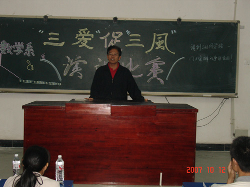 为认真贯彻学院布署的“抓三爱促三风” 的活动,数学系于2007年10月12日19:40在五栋320教室举行了演讲比赛。