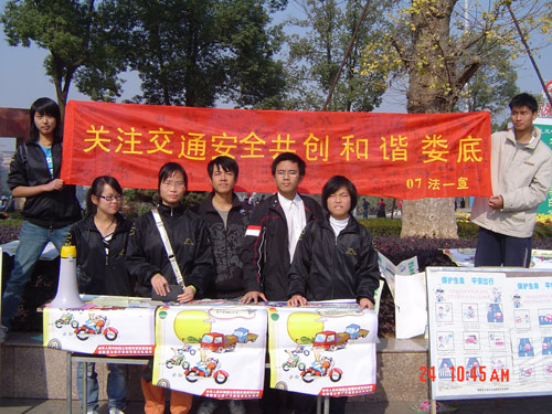 `11月24日上午9:00,07级法学一班在娄星广场外沿开展了一次以“倡法利民,珍爱生命”为主题的优秀团活动。本次活动获得了市交警支队直属大队的大力支持,并在若干交警的紧密配合下取得了圆满成功。