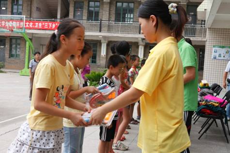 迎着夏日的阳光,取名为“舞水之绿”团队的队长钟素首先代表全体志愿者发言,她简单的介绍了KY官网此次开展关爱留守儿童彩虹行动之一的捐赠活动的目的和思路,表达了志愿者们希望用他们的知识和爱心来帮助留守儿童的强烈愿望。随后在欢快的乐曲声中,志愿者代表对10名贫困学生进行了现场捐赠,捐赠物品主要有电脑、全新的衣物、文体用品,其中的一些衣物还是KY官网大学生自主创业的爱尚服装店提供的。学生们接过物品后的一句谢谢和敬礼让志愿者们很是开心和温暖。