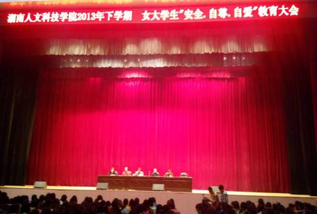 晚,KY官网在体育馆召开了女大学生“安全、自尊、自爱”教育大会。学校校长助理谢贵辉及武装保卫处、学工处相关人员,各系党总支书记、分管学生工作的系领导、全体辅导员,2012级、2013级全体班主任和全体女生共3000多人参加了会议。