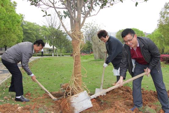 4 月 3 日 上午,中文系9204班校友向母校捐赠了两棵桂花树。校长助理谢贵辉,校友办、中文系负责人、中文系校友代表等人将桂花树植在海圆广场。(宣传部)