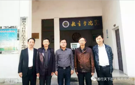 ▲教育学院院长刘超良(中)、副书记徐建东(右二)、副院长李国强(左二)与善行天下负责人李人民(右一)、李建辉(左一)