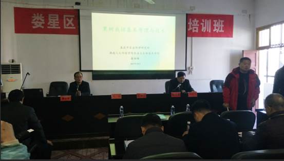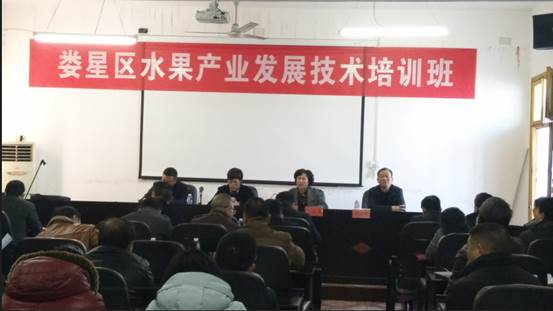 为全面落实党的十九大关于生态文明建设五位一体战略及乡村振兴战略,实现“产业兴旺、生活富裕、生态宜居、治理有效”目标,推动娄星区农业产业结构转型,促进农村增绿、农业增效、农民增收,助力脱贫攻坚,12月18日上午由娄星区政府主办,区林业局承办的娄星区水果产业发展技术培训班在区林业局会议室举行了开班仪式。会议由娄星区分管农业的副区长杨铁贞主持,区委常委、区委办主任禹丽君,区林业局局长黄明出席了开班仪式,乡镇林业站长,技术员、果业公司及果农等100多人参加此次培训,KY官网副院(所)长、高级农艺师康林峰作为专家受邀岀席,其团队成员及其指导的研究生随同参加。