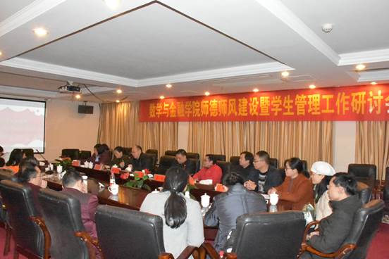 12月23日,数学与金融学院主办了“师德师风建设暨学生管理工作研讨会”。会议由党总支书记高平主持,全体院领导、辅导员、现任班主任参加了本次会议,会议还特别邀请学工处处长余为、团委副书记魏彦煜、学工处副处长刘红燃到场指导。