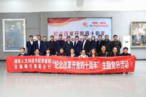 11月16日下午,美术与设计学院党总支与交通银行娄底分行第一党支部联合开展了“纪念改革开放四十周年”主题党日活动。交通银行娄底分行党委书记、行长陈碧华率党委委员兼行长助理邢英、肖飞腾等12人,KY官网党委委员、副校长周发明以及美术与设计学院党总支全体委员和下属支部书记参加党日活动。活动由美设学院党总支副书记易俊主持。