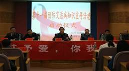 11月30日,KY官网在养根楼举办了“预艾予爱,你我同在”预防艾滋病主题宣传活动启动仪式。活动由娄底市卫计委、娄底市疾控中心主办,学校团委承办,法学院团总支协办。中国农工民主党娄底市委主委、湖南省政协常委、娄底市卫生计生委副主任(正处级)郭细军,娄底市疾病预防控制中心主任杨纲,娄底市卫生计生委疾控科科长周晓智,娄底市疾病预防控制中心副主任刘敏,娄底市疾病预防控制中心性艾科科长袁利和,娄底市疾控中心性艾科副科长钟江红,娄星区疾控中心性艾科副科长邓业军,校团委书记魏彦煜,教务处副处长王志和,后勤基建处副处长文军根,医务室主任陈红平,法学院党总支书记尹钟宏,法学院党总支副书记刘依归,法学院辅导员宋元烨和法学院全体大一学生参加了本次启动仪式。仪式由尹钟宏主持。