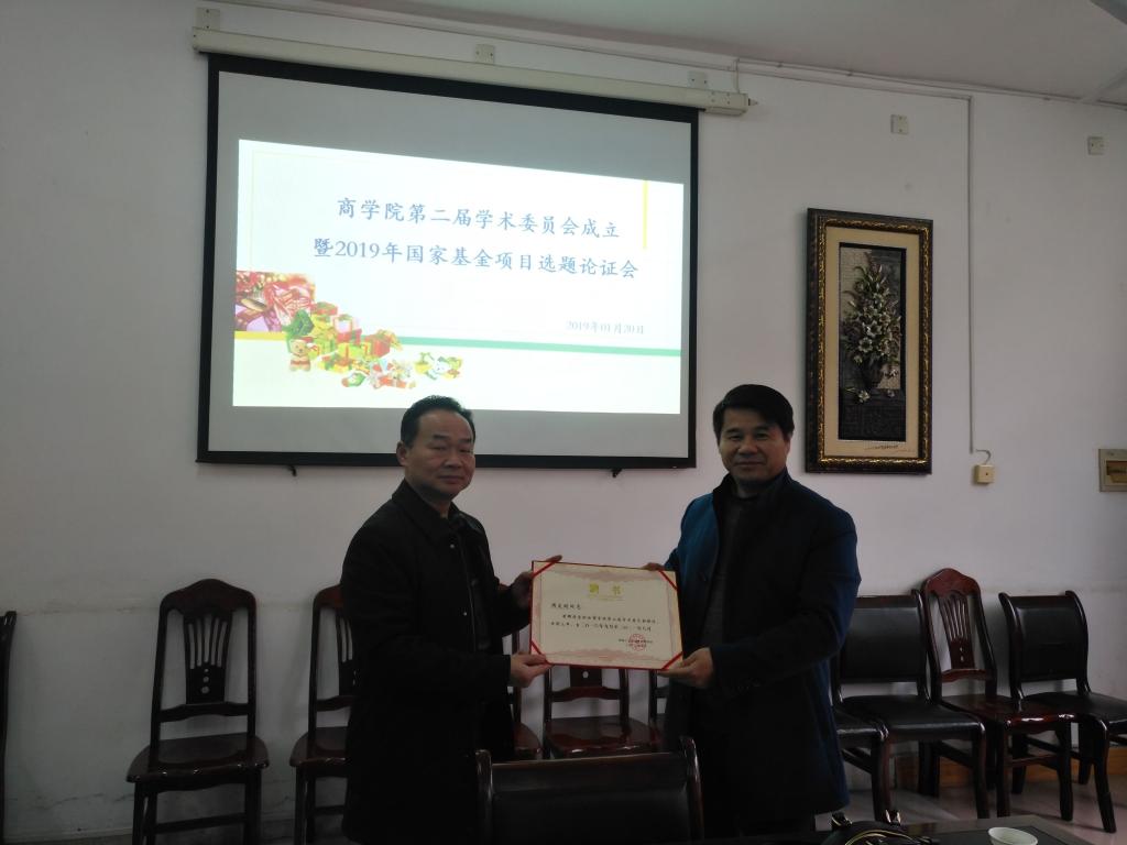 1月20日上午,商学院在同德楼会议室举办第二届学术委员会成立大会暨2019年国家基金项目选题论证会,副校长周发明教授、新晃侗族自治县人民政府副县长肖卫博士应邀莅临指导,院学术委员会成员、2019年国家基金项目申报人参加会议。会议由商学院副院长王晓军主持。