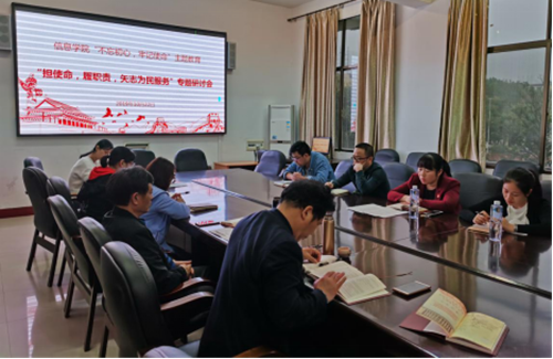 10月22日下午,信息学院党总支在百全楼211会议室组织开展了“担使命,履职责,矢志为民服务”专题研讨会,信息学院党总支委员、支部书记参加了本次研讨。机关党委书记刘纲华、组织部党建管理科科长辛浩林参会指导。