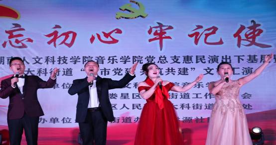 10月29日晚,由音乐舞蹈学院党总支部举办的“不忘初心、牢记使命”文艺汇演在娄底市娄星区大科街道办事处洪源社区举行。组织部常务副部长罗求实、机关党委书记刘纲华、宣传统战部副部长陈璐、音乐舞蹈学院党总支书记周邦春、副书记邓莉立、副院长吴扎拉·涛、副院长刘利连及洪源社区领导代表出席本次活动。音乐舞蹈学院全体师生党员及部分学生群众共同为洪源社区的父老乡亲们奉上了一台精彩的红色演出。