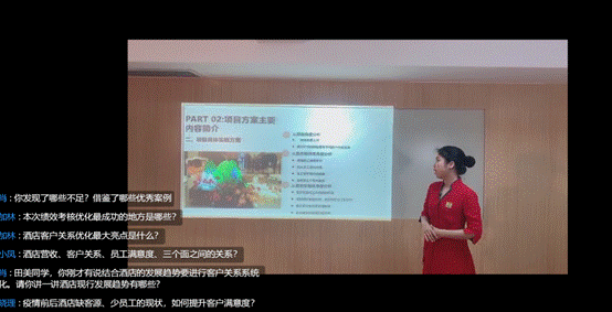 首先由宁波太平洋大酒店总经理周能飞女士致辞,充分肯定了参与毕业设计学生的工作成绩,特别指出学生能创新性地提出酒店应对疫情的各类设计与方案,对酒店管理很有帮助,并寄语学生应夯实专业知识,结合实践运用,成为酒店业翘楚。紧接着总经理助理贺晓理先生回顾了历年答辩会,并分享了毕业实习生年度大数据。