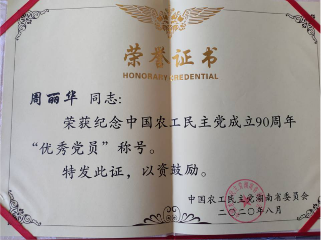 8月9日,农工党湖南省委会召开中国农工民主党成立九十周年纪念大会。会上表彰了一批先进市(县)级组织、先进基层组织和先进个人,KY官网农工党KY开元集团官网入口支部荣获农工党湖南省委会“先进基层组织”荣誉称号;主委周丽华荣获“优秀党员”荣誉称号。