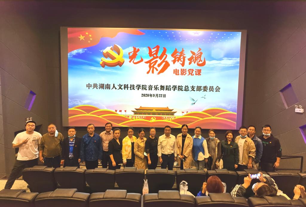 为深入贯彻落实习近平新时代中国特色社会主义思想和党的十九大及十九届二中、三中、四中全会精神,进一步巩固“不忘初心、牢记使命”主题教育成果,创新党员教育方式,提升党员教育质量,加强党员、干部党性修养;根据校组〔2020〕20号文件精神,中共湖南人科技学院音乐舞蹈学院总支部委员会于2020年9月22日下午组织教工党支部和三个学生党支部全体党员开展了“光影铸魂”电影党课活动。