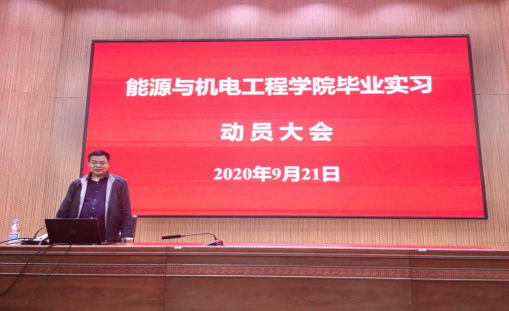 9月21日上午,能源与机电工程学院2017级学生毕业实习动员大会在匠成楼报告厅召开,教务处处长羊四清、学院党政领导、实习带队老师、2017级各班班主任、企业代表以及2017级全体学生参加了此次会议。会议由院长谢常清主持。