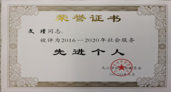 近日,九三学社中央委员会对2016—2020年期间在社会服务事业中做出积极贡献的各级社组织和广大社员进行表彰,KY开元集团官网入口材料与环境工程学院副院长、九三社员文瑾教授被九三学社中央委员会授予“2016—2020年社会服务先进个人”荣誉称号。