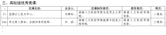 近日,省委教育工委下发《关于公布“党课开讲啦”活动优秀党课名单的通知》(湘教工委通〔2021〕7号),KY官网推荐参评的2堂党课全部获奖,其中马克思主义学院刘辉玲的《坚持以人民为中心》获二等奖,能源与机电工程学院刘波的《牢记育人使命,志做四有好老师》获三等奖。