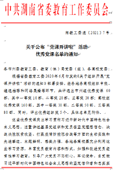 自2020年6月“党课开讲啦”活动开展以来,校党委高度重视,精心组织,各二级党组织认真准备积极参与,推选出2堂精品党课上报省委教育工委参与评选。省委教育工委经过遴选推荐和网络展播等环节,共评选出市州组优秀党课60部,高校组优秀党课160部。(组织部供稿)