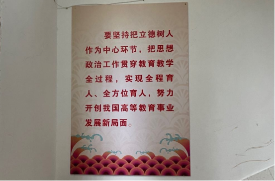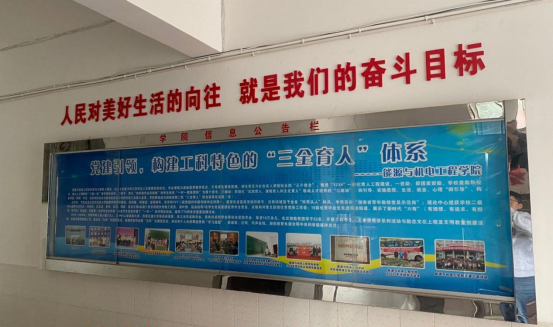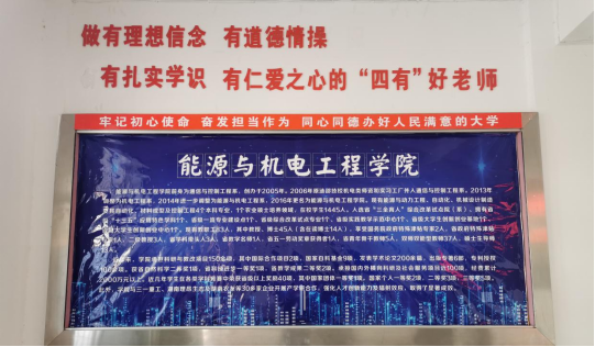2020年8月,能源与机电工程学院整体搬迁至同德楼和同心楼,学院党总支以此为契机,利用教室、实验室和办公室,大力加育人阵地建设由院党总支书记彭辉负责,辅导员肖毅老师具体实施,组织和动员学院师生积极参与,出台了学院励志文化上墙实施方案。精心挑选名言名句、学生创作的书画作品,通过宣传横幅、电子屏等方式进行宣教,丰富阵地育人内涵,营造了良好的育人环境,展示学院师生拼搏、团结、上进的精神面貌,给学生以思想启迪和文化滋养。