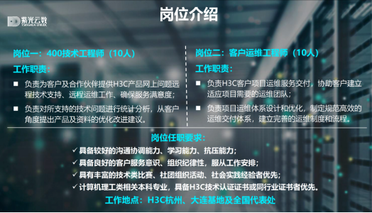 本次招聘宣讲会是由紫光云数科技有限公司面向全国15所高校网络工程一流专业开展的,拟招聘20位技术支持工程师外派新华三集团工作,其中包括H3C远程技术支持工程师10位、H3C客户运维工程师10位。