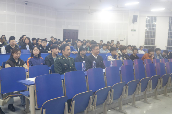 退役士兵代表唐振宁从入伍的条件、基本流程、国防意义、当兵的好处、优惠政策、征兵时间及报名地址等方面为同学们进行了详细讲解。同时,他从亲身经历出发,分享自己军旅生涯的心得体会,用鲜活的事例展现了军人的血性担当,诠释了军人的家国情怀与战友情谊,进一步激发广大青年学子积极投身国防建设的热情。