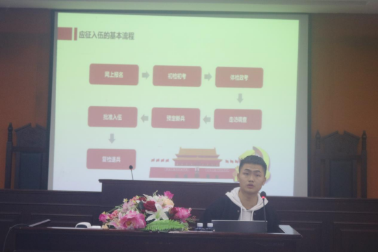 习近平总书记曾说:“青春是用来奋斗的,吾辈青年当自强不息,报效祖国。”报国的道路有千万条,参军入伍一定是最光荣的征途。刘依归书记用简短有力的话语引入本次会议主题,阐明应征入伍对于国家的重要意义。随后,他向大家介绍了本次到场的退役复学士兵,鼓励大家学习他们的优良品质,向优秀看齐。