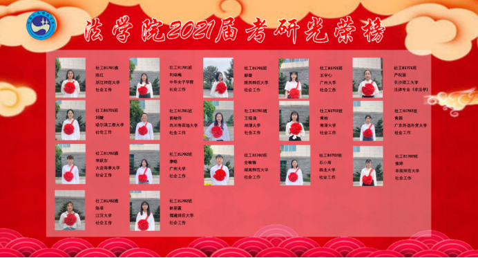 法学院2021届社会工作专业毕业生考研成绩喜人,17人被哈尔滨工程大学、湖南师范大学、西北大学、陕西师范大学、华南师范大学、大连海事大学等双一流院校录取。社会工作专业首届毕业生共26人报名参加研究生考试,考研录取率高达65.38%。