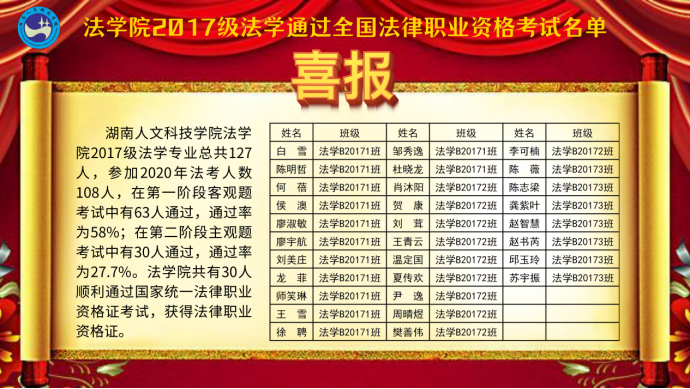 法学院2021届法学专业毕业生108人参加全国统一的法律职业资格考试,63人通过第一轮客观题考试,通过率达58.33%;30人通过第二轮主观题考试并获得法律职业资格证书,通过率27.78%,远超全国法考通过率。