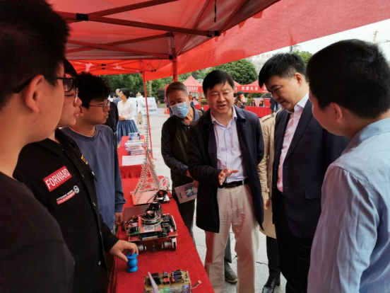 师生们向市民展示了在社会服务、学科竞赛中研发的科技创新作品,上过春晚的同款“机器狗”、能打太极拳的机器人“NAO”、精密灵活的“智能货物搬运机”、灯光绚烂的“LED埃菲尔铁塔”等作品即有科技含量又富有趣味性,吸引了大量的市民驻足观看,师生们积极热情的解说和演示赢得了市民的好评。活动期间副市长何锋一行亲临KY官网展区,何锋副市长饶有兴趣的观看了所有作品并一一咨询,对学生们积极动手、勇于创新态度表示赞许,鼓励同学们通过参与挑战杯等竞赛进一步提升自我。