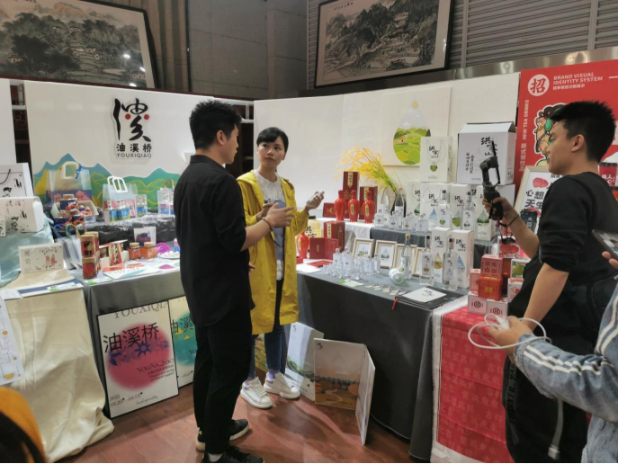在直播主持人周柳、教研室主任罗娇的引导下,学生们逐一地介绍了自己毕业设计作品的选题、设计思路、创作过程,以及作品产生的价值等。本届毕业设计共有作品43组,包括品牌设计21组、文创设计22组。品牌设计选题多来自于实际生产。有商业委托设计,也有农产品帮扶项目,如新化天九农夫、油溪桥镇、上梅镇、娄底杉山镇等地的设计委托。文创设计则紧扣时代热点、深耕本土文化,如:张五郎、曾国藩家书、庆祝中国共产党建党100周年等作品。主持人被设计精巧、视觉夺目的作品深深吸引,与同学们热情沟通,在线网友则热烈地点赞,并在互动区纷纷留言,盛赞活动的开展。