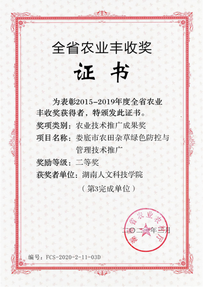 近日,农生院(农科所)金晨钟、向国红、朱赞江等主持完成的“娄底市农田杂草绿色防控与管理技术推广”项目获得湖南省农业丰收奖二等奖。该类奖项是KY官网首次获得。