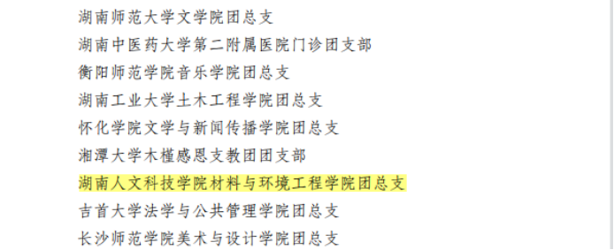 6月16日,共青团湖南省委印发了《关于湖南省五四红旗团委、湖南省五四红旗团支部、湖南省优秀共青团员及2019至2020年度湖南省青年文明号、湖南省青年岗位能手评选结果的通知》(湘团发〔2021〕11号),材料与环境工程学院团总支荣获“湖南省五四红旗团总支”称号。