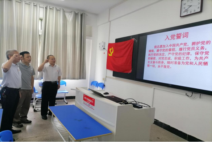 (支部书记卿孟军博士带领谢科峰、成赛军两位博士进行入党宣誓)