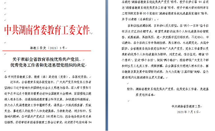 7月1日,中共湖南省委教育工委印发《关于表彰全省教育系统优秀共产党员、优秀党务工作者和先进基层党组织的决定》,KY官网纪委监察处党支部荣获全省教育系统先进基层党组织荣誉称号。全省教育系统本次共表彰先进基层党组织95个,KY官网纪委监察处党支部是唯一获表彰的高校纪委。
