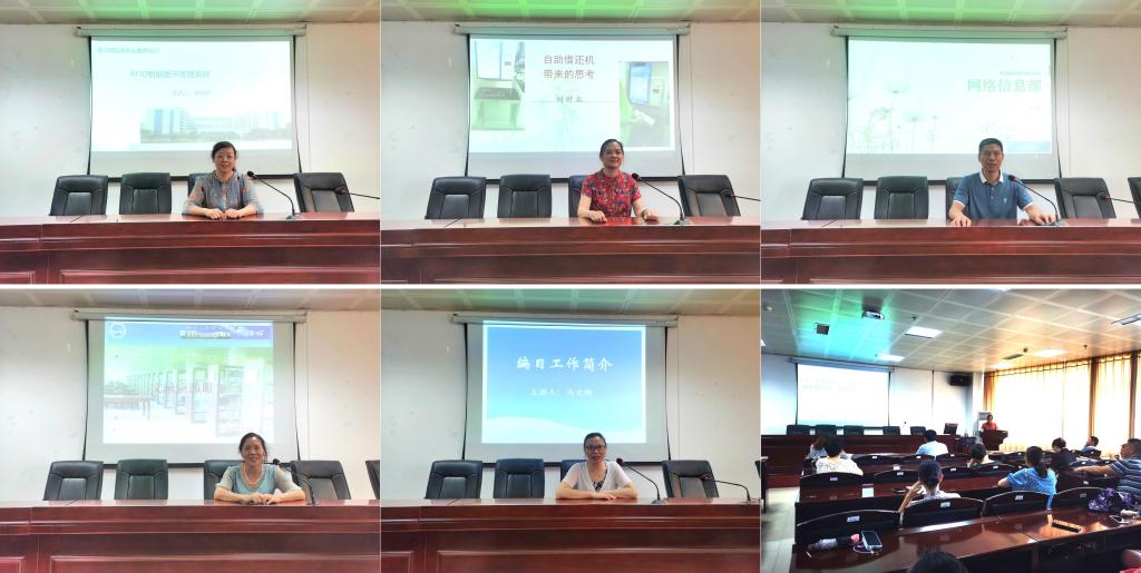 副馆长申彦舒、文献资源建设部主任马文卿、读者服务部主任刘时容、文献资源借阅部主任刘燕、网络信息部主任熊兆辉分别进行业务培训授课,作了题为《RFID智能图书管理系统》《编目工作简介》《自助借还机带来的思考》《文献资源服务》《网络信息服务》等主题讲座,授课内容既有对图书馆基本业务知识的详细介绍,又有对图书馆具体工作的整体把握与布局,更有对图书馆高质量服务的合理化建议与思考。决心转变服务理念,提升业务能力,提高服务水平,更好地为教学科研服务。