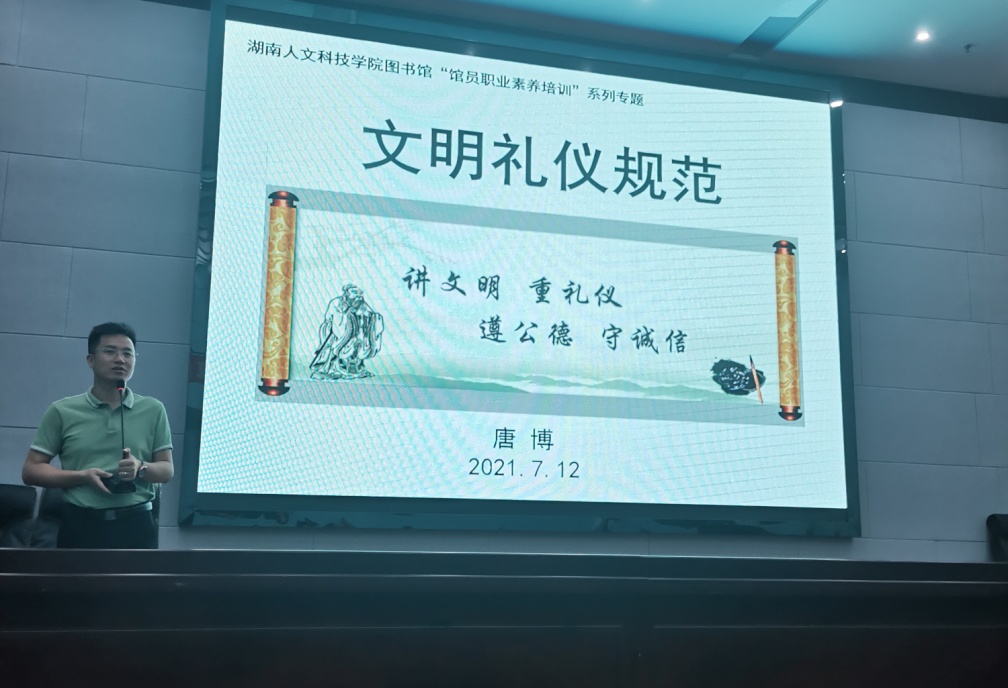 音乐舞蹈学院唐博副教授作了文明礼仪规范专题讲座,从现代礼仪、形象礼仪、社交礼仪、微笑礼仪、服务礼仪等方面阐释了礼仪的“知”与“行”。同时,结合图书馆的岗位职责,围绕图书馆服务礼仪和职工岗位语言行为示范等对图书馆馆员的礼仪修养、服饰搭配进行了重点讲解,强调馆员在服务读者时,不仅要做到知礼,更要践礼。