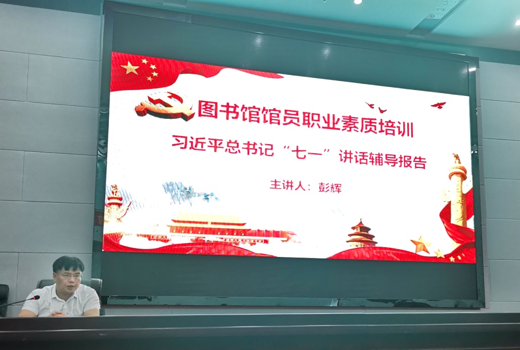 图书馆党支部书记、馆长彭辉作了习近平总书记“七一”讲话精神宣讲的辅导报告。他带领馆员深入学习习近平总书记在庆祝中国共产党成立100周年大会上的重要讲话精神,深刻阐述重要讲话的核心要义和丰富内涵,鼓励大家从党的历史中汲取精神力量,强化使命担当,牢固树立为师生服务的思想,切实提高图书馆的服务质量。
